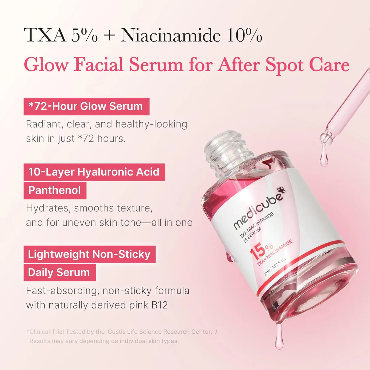 - This serum consists of 5% TXA and 10% Niacinamide, which offers 72 hours of glow-on-the-face after-spot care.